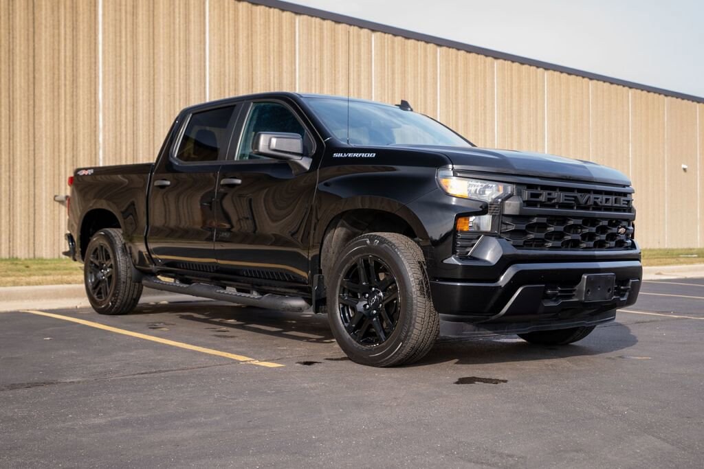 Custom Convenience Package (Electric Rear-Window Defogger, EZ Lift Power Lock & Release Tailgate, LED Cargo Area Lighting, Remote Vehicle Starter System, and Theft Deterrent System (Unauthorized Entry)), Custom Value Package, High Capacity Suspension Package, Preferred Equipment Group 1CX (10-Way Power Driver Seat w/Lumbar, 120-Volt Bed Mounted Power Outlet, 120-Volt Instrument Panel Power Outlet, 3.5 Monochromatic Display Driver Info Center, Bluetooth® For Phone, Chevrolet Connected Access Capable, Color-Keyed Carpeting Floor Covering, Compass, Deep-Tinted Glass, Dual Rear USB Ports (Charge Only), Electrical Steering Column Lock, Electronic Cruise Control, Front Frame-Mounted Black Recovery Hooks, Front Rubberized Vinyl Floor Mats, HD Rear Vision Camera, Manual Tilt Wheel Steering Column, OnStar & Chevrolet Connected Services Capable, Power Front Windows w/Driver Express Up/Down, Power Front Windows w/Passenger Express Down, Power Rear Windows w/Express Down, Rear 60/40 Folding Bench Seat (Folds Up), Rear Rubberized-Vinyl Floor Mats, Remote Keyless Entry, SiriusXM Radio, Standard Tailgate, Wi-Fi Hot Spot Capable, and Wireless Phone Projection), Trailering Package (Hitch Guidance), Silverado 1500 Custom, CarBravo Certified Tier Certified, 8-Speed Automatic, 4WD, Black Cloth, 3.42 Rear Axle Ratio, 4-Wheel Disc Brakes, 4 Black Round Assist Steps (LPO), 40/20/40 Front Split-Bench Seat, 6 Speakers, 6-Speaker Audio System, ABS brakes, Air Conditioning, Alloy wheels, AM/FM radio: SiriusXM, Apple CarPlay/Android Auto, Auto High-beam Headlights, Automatic Emergency Braking, Brake assist, Bumpers: body-color, Chevytec Spray-On Black Bedliner, Cloth Seat Trim, Delay-off headlights, Driver door bin, Driver vanity mirror, Dual front impact airbags, Dual front side impact airbags, Electronic Stability Control, Following Distance Indicator, Forward Collision Alert, Front anti-roll bar, Front Center Armrest w/Storage, Front License Plate Kit, Front Pedestrian Braking, Front reading lights, Front wheel independent suspension, Fully automatic headlights, Heated door mirrors, Illuminated entry, IntelliBeam Automatic High Beam On/Off, Lane Keep Assist w/Lane Departure Warning, Low tire pressure warning, Manual Tilt/Telescoping Steering Column (DISC), Not Equipped w/Rear USB Ports, Not Equipped w/Steering Column Lock, Occupant sensing airbag, Outside temperature display, Overhead airbag, Overhead console, Panic alarm, Passenger door bin, Passenger vanity mirror, Power door mirrors, Powe